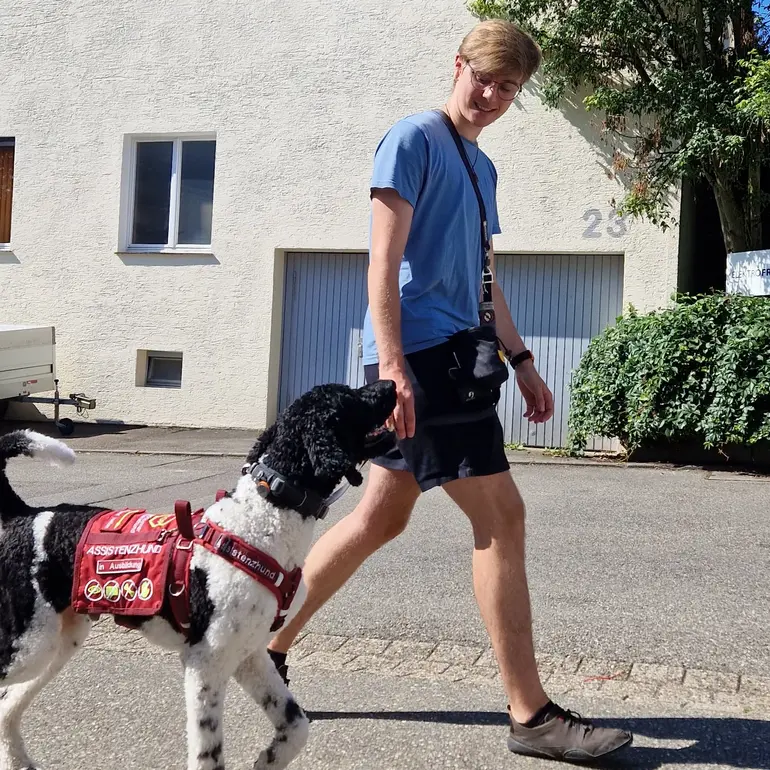 Peet ist Mikas Assistenzhund in Ausbildung. Er unterstützt ihn in vielen Bereichen: Er gibt ihm Sicherheit in unübersichtlichen Situationen, schafft Abstand zu anderen Menschen in engen Räumen, dient ihm als stabiler Anker und lernt derzeit, ihn frühzeitig vor Schmerzattacken zu warnen.